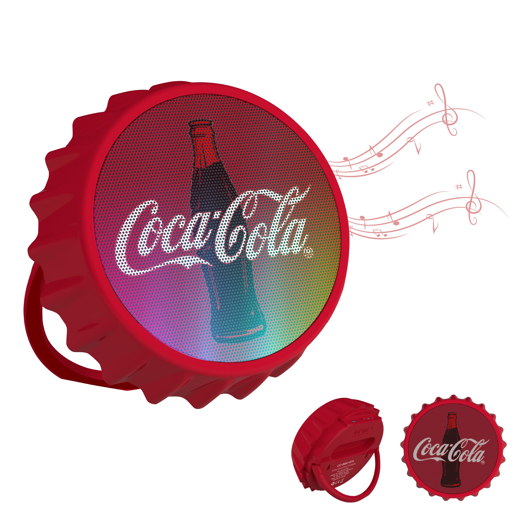 Coca-Cola Bottle Cap Shaped LED Light Bluetooth Speaker, Wall Mountable, Kick Stand, FM Radio